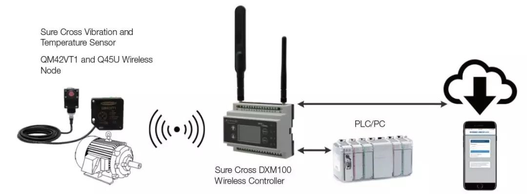 振动加剧和温度异常升高是电动机运转异常,随即出现严重故障的前兆,必须随时发现并查明原因而排除。对此,邦纳推出基于工业物联网(IIoT)应用DXM无线控制器、QM30VT无线振动及温度传感器的设备健康监测(EHM)预防性维护解决方案,当设备超过预先定义的参数值时机器可以发出预判性的报警信号。