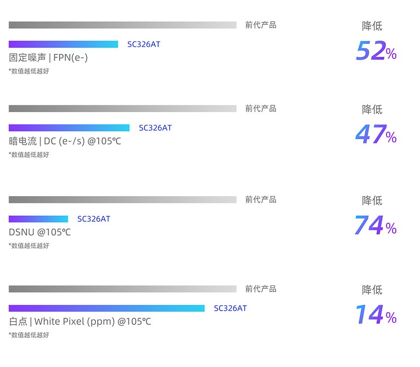 SC326AT基于思特威先进的CarSens®-XR工艺技术、SFCPixel®技术和读取电路架构优化设计,在噪声抑制和高温成像稳定性方面实现了性能提升。在最大增益模式下,SC326AT的固定噪声(FPN)较前代产品大幅降低约52%,能够让车载摄像头在暗光环境下的成像更清晰干净。同时,SC326AT在105℃高温环境下的暗电流(DC)、DSNU和白点(White Pixel)分别降低约47%、74%和14%,在面临高温长时间运行环境时能为车载摄像头提供稳定、可靠的实时影像信息。